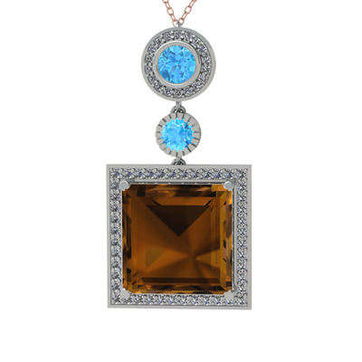 Dumanlı kuvars, akuamarin ve beyaz zirkon 14 ayar beyaz altın kolye (40 cm gümüş rolo zincir)