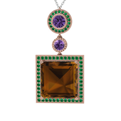 Dumanlı kuvars, ametist ve yeşil kuvars 18 ayar rose altın kolye (40 cm beyaz altın rolo zincir)