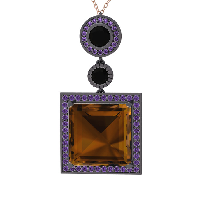 Dumanlı kuvars, siyah zirkon ve ametist 925 ayar siyah rodyum kaplama gümüş kolye (40 cm rose altın rolo zincir)