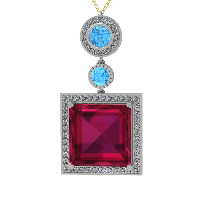 Rodolit garnet, akuamarin ve beyaz zirkon 14 ayar beyaz altın kolye (40 cm gümüş rolo zincir)
