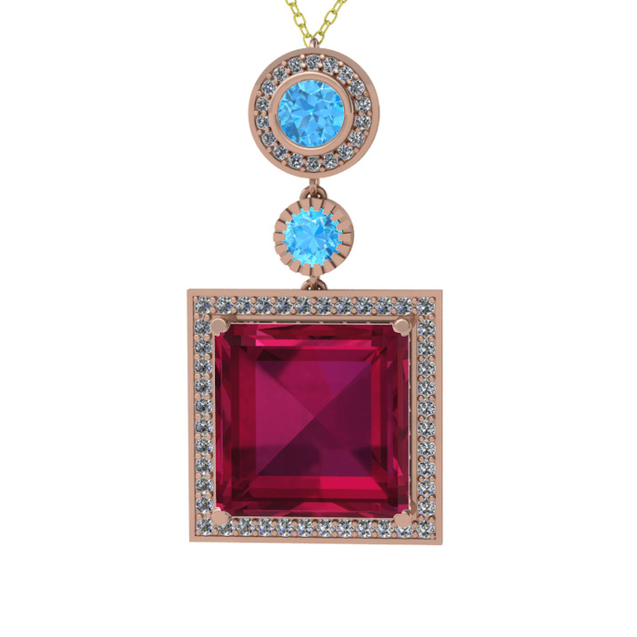 Rodolit garnet, akuamarin ve beyaz zirkon 14 ayar rose altın kolye (40 cm altın rolo zincir)