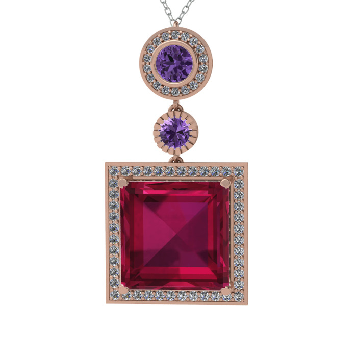 Rodolit garnet, ametist ve beyaz zirkon 8 ayar rose altın kolye (40 cm beyaz altın rolo zincir)