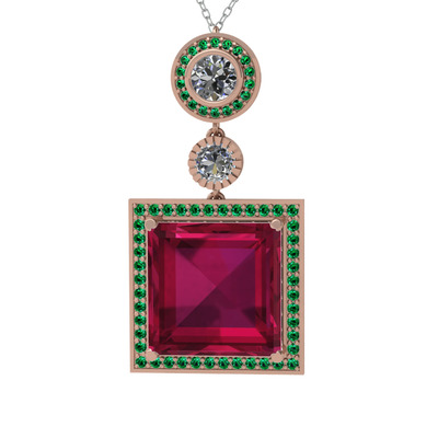 Rodolit garnet, beyaz zirkon ve yeşil kuvars 14 ayar rose altın kolye (40 cm gümüş rolo zincir)