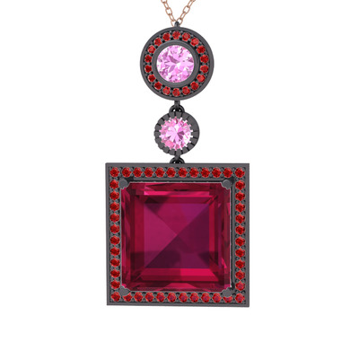 Rodolit garnet, pembe kuvars ve garnet 925 ayar siyah rodyum kaplama gümüş kolye (40 cm rose altın rolo zincir)