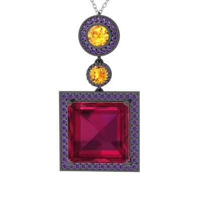 Rodolit garnet, sitrin ve ametist 925 ayar siyah rodyum kaplama gümüş kolye (40 cm gümüş rolo zincir)