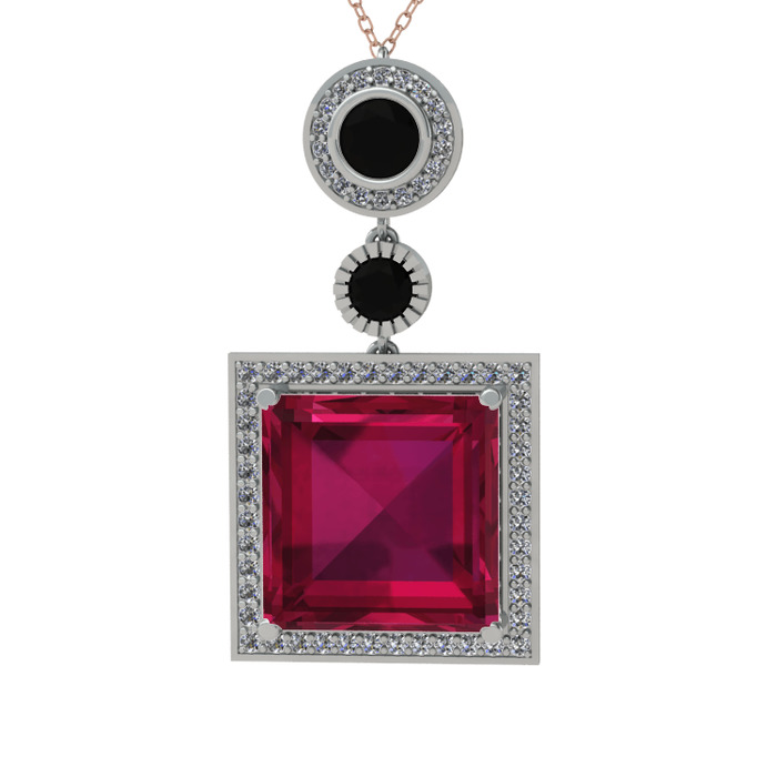 Rodolit garnet, siyah zirkon ve beyaz zirkon 14 ayar beyaz altın kolye (40 cm rose altın rolo zincir)