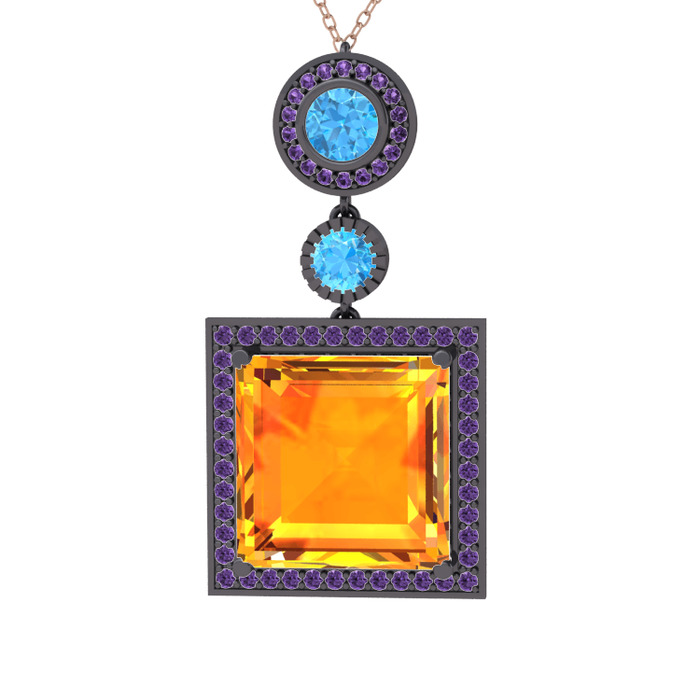 Sitrin, akuamarin ve ametist 925 ayar siyah rodyum kaplama gümüş kolye (40 cm gümüş rolo zincir)