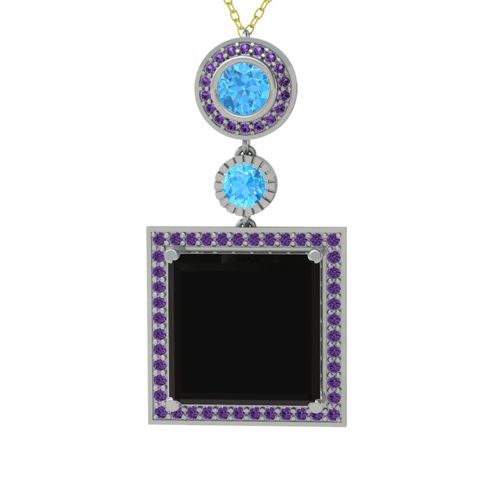 Siyah zirkon, akuamarin ve ametist 8 ayar beyaz altın kolye (40 cm gümüş rolo zincir)