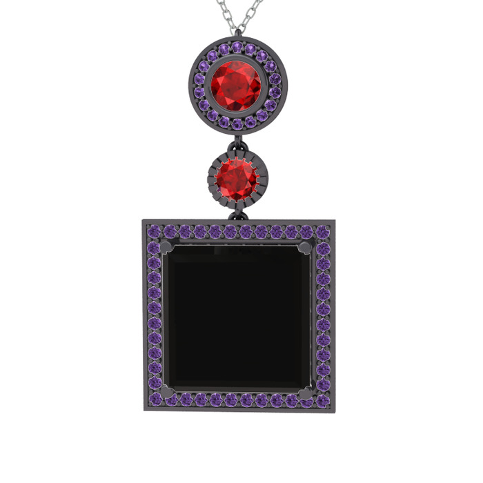 Siyah zirkon, garnet ve ametist 925 ayar siyah rodyum kaplama gümüş kolye (40 cm beyaz altın rolo zincir)