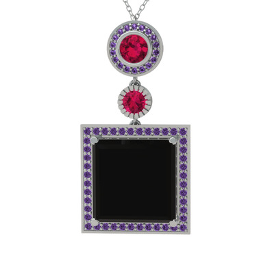 Siyah zirkon, rodolit garnet ve ametist 14 ayar beyaz altın kolye (40 cm gümüş rolo zincir)