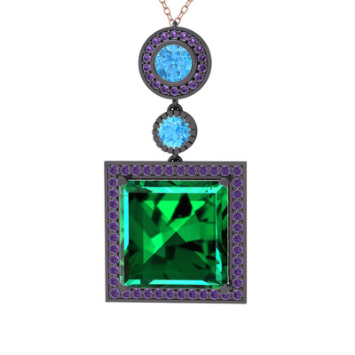 Yeşil kuvars, akuamarin ve ametist 925 ayar siyah rodyum kaplama gümüş kolye (40 cm gümüş rolo zincir)