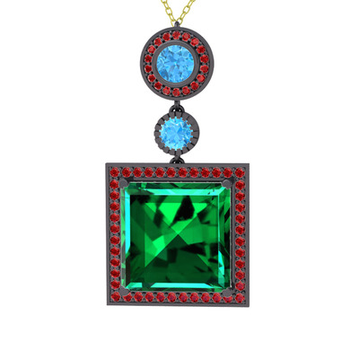 Yeşil kuvars, akuamarin ve garnet 925 ayar siyah rodyum kaplama gümüş kolye (40 cm gümüş rolo zincir)