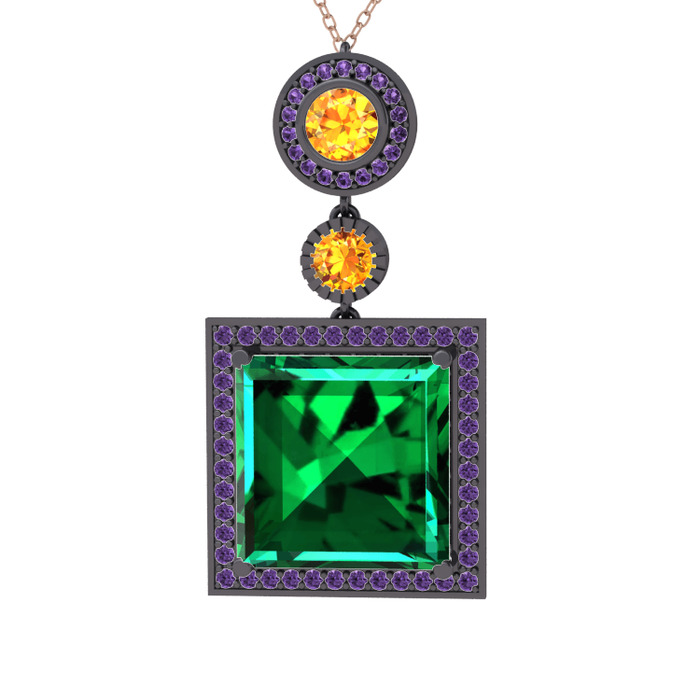 Yeşil kuvars, sitrin ve ametist 925 ayar siyah rodyum kaplama gümüş kolye (40 cm rose altın rolo zincir)