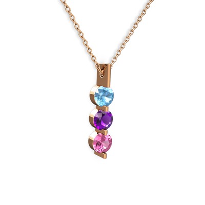 Akuamarin, ametist ve pembe kuvars 8 ayar rose altın kolye (40 cm gümüş rolo zincir)
