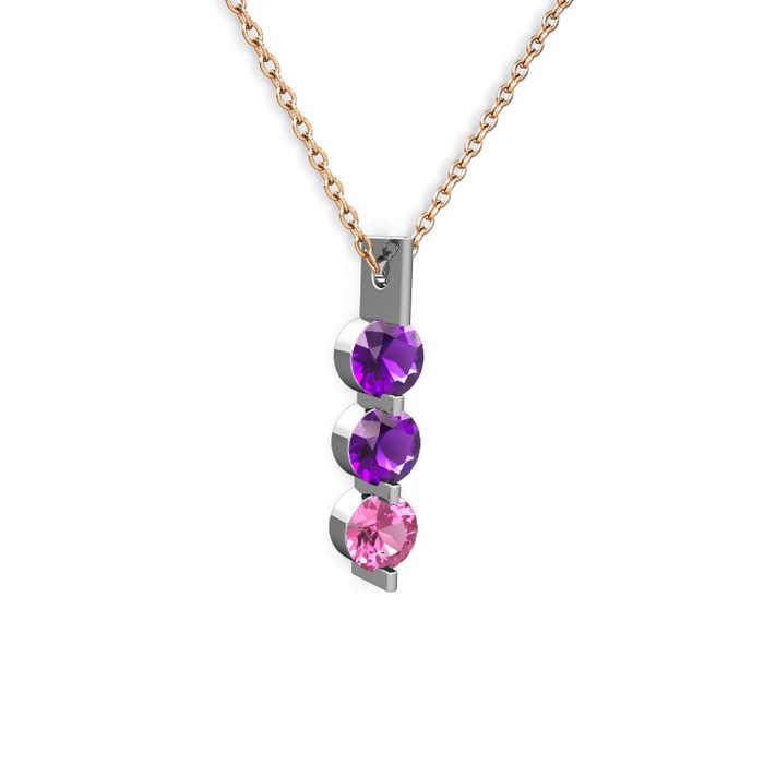 Ametist ve pembe kuvars 8 ayar beyaz altın kolye (40 cm rose altın rolo zincir)