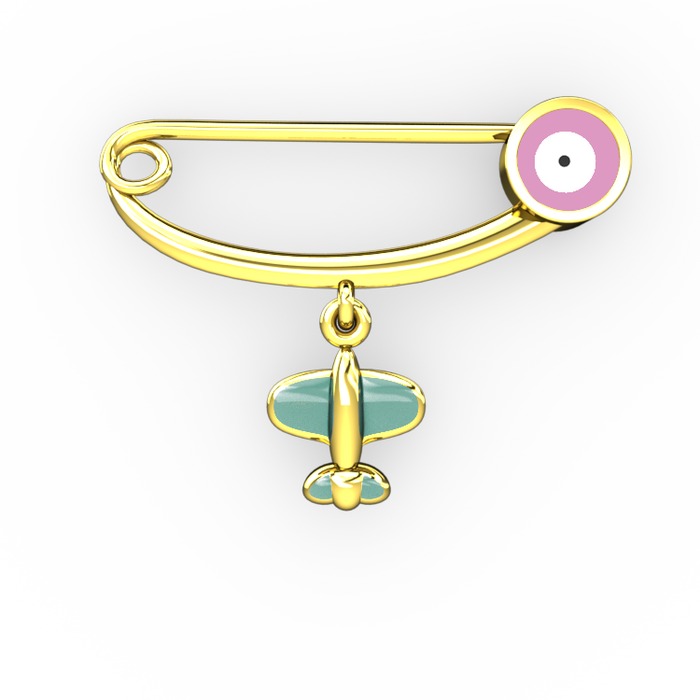 Uçaklı Yuvarlak Nazar İğne - 925 ayar altın kaplama gümüş nazar iğnesi (Pembe mineli)