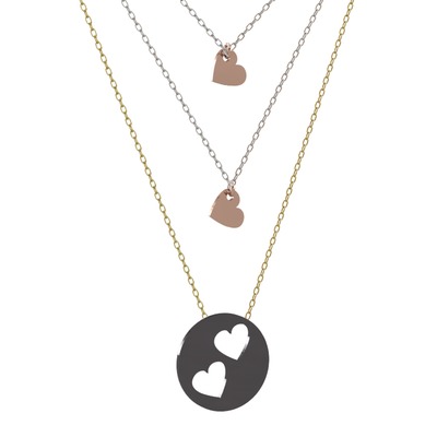 Üçlü Kalp Kolye - 14 ayar rose altın kolye (45 cm gümüş rolo zincir)