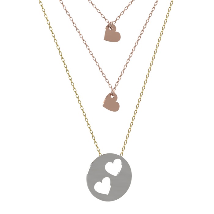 Üçlü Kalp Kolye - 14 ayar rose altın kolye (45 cm rose altın rolo zincir)