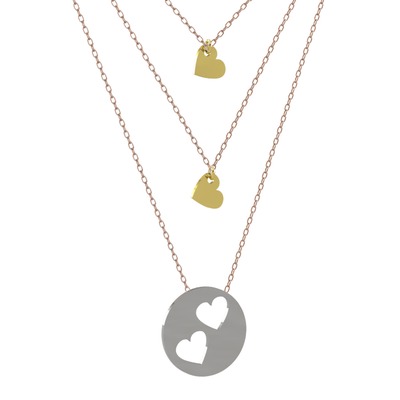 Üçlü Kalp Kolye - 925 ayar altın kaplama gümüş kolye (45 cm rose altın rolo zincir)