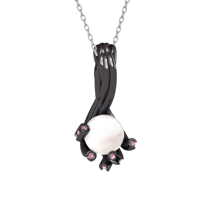Inci ve pembe kuvars 925 ayar siyah rodyum kaplama gümüş kolye (40 cm beyaz altın rolo zincir)