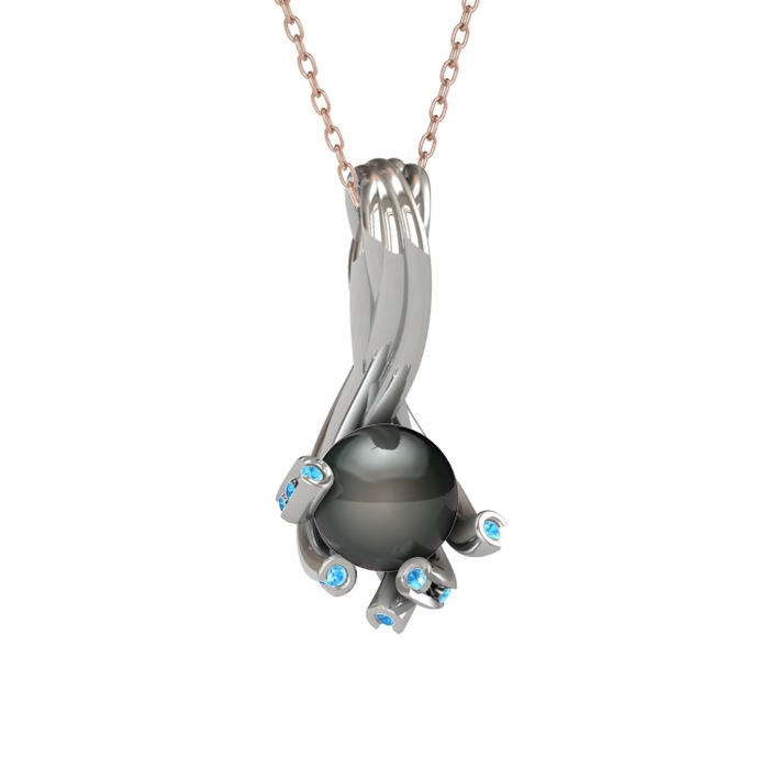 Siyah inci ve akuamarin 925 ayar gümüş kolye (40 cm gümüş rolo zincir)