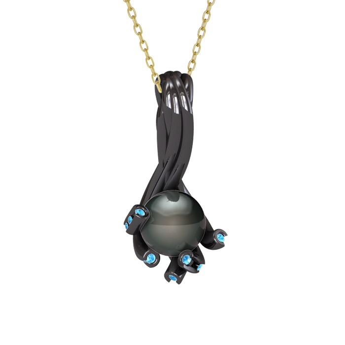Siyah inci ve akuamarin 925 ayar siyah rodyum kaplama gümüş kolye (40 cm altın rolo zincir)