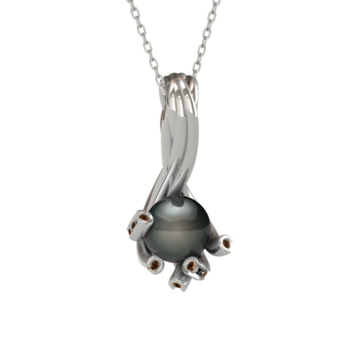 Siyah inci ve dumanlı kuvars 14 ayar beyaz altın kolye (40 cm beyaz altın rolo zincir)