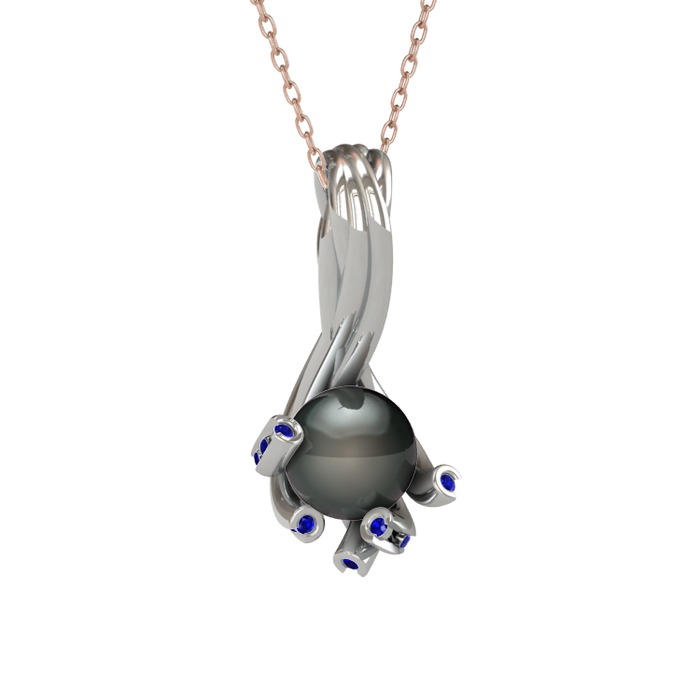 Siyah inci ve lab safir 18 ayar beyaz altın kolye (40 cm gümüş rolo zincir)