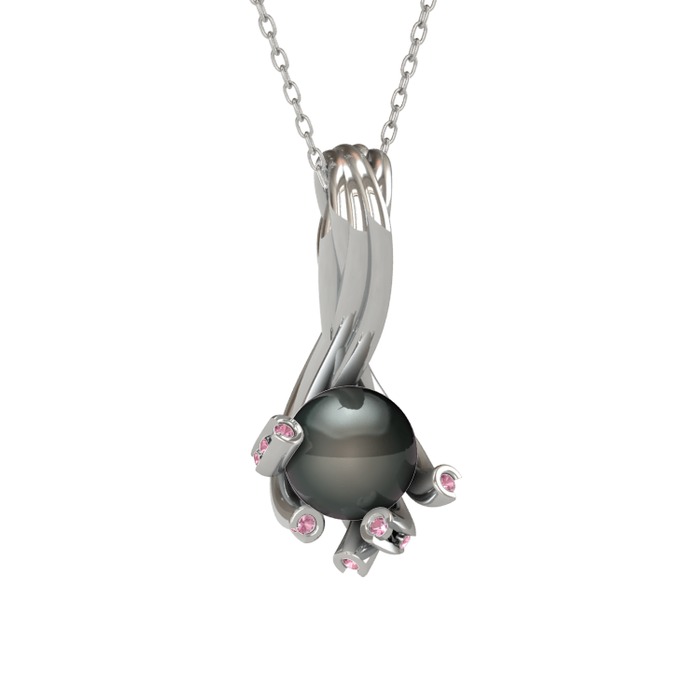 Siyah inci ve pembe kuvars 925 ayar gümüş kolye (40 cm beyaz altın rolo zincir)