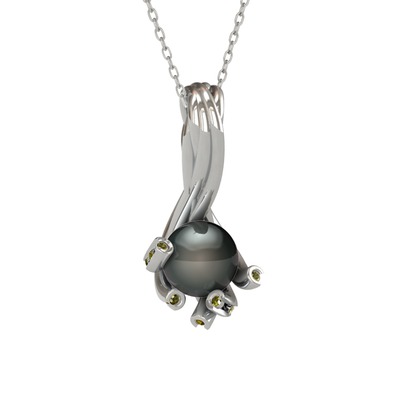 Siyah inci ve peridot 18 ayar beyaz altın kolye (40 cm gümüş rolo zincir)