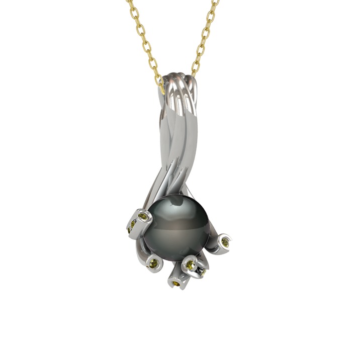 Siyah inci ve peridot 8 ayar beyaz altın kolye (40 cm altın rolo zincir)