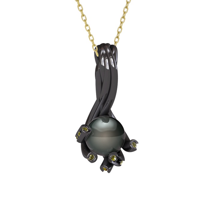 Siyah inci ve peridot 925 ayar siyah rodyum kaplama gümüş kolye (40 cm altın rolo zincir)