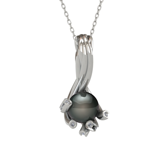 Siyah inci ve pırlanta 8 ayar beyaz altın kolye (0.225 karat, 40 cm beyaz altın rolo zincir)