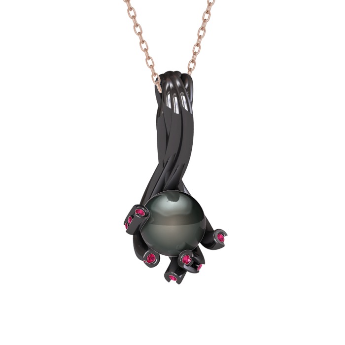 Siyah inci ve rodolit garnet 925 ayar siyah rodyum kaplama gümüş kolye (40 cm rose altın rolo zincir)