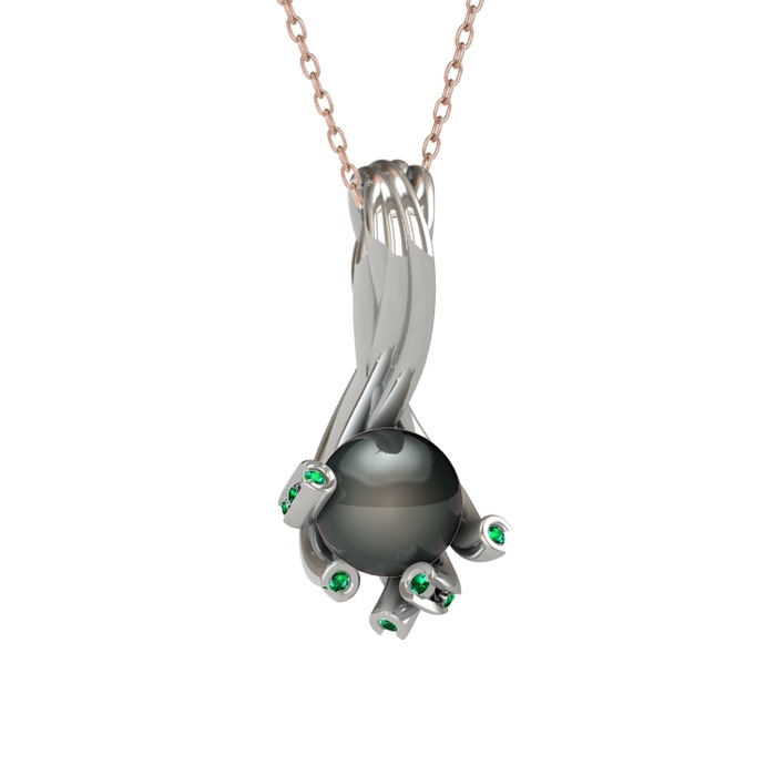 Siyah inci ve yeşil kuvars 18 ayar beyaz altın kolye (40 cm rose altın rolo zincir)