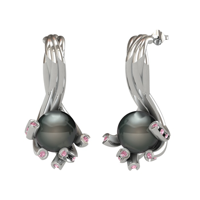 Siyah inci ve pembe kuvars 14 ayar beyaz altın küpe