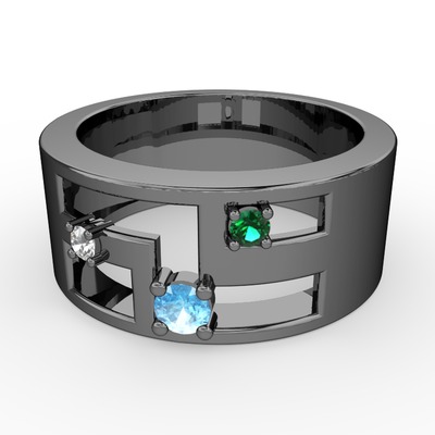 Akuamarin, beyaz zirkon ve yeşil kuvars 925 ayar siyah rodyum kaplama gümüş yüzük