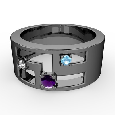 Ametist, beyaz zirkon ve akuamarin 925 ayar siyah rodyum kaplama gümüş yüzük
