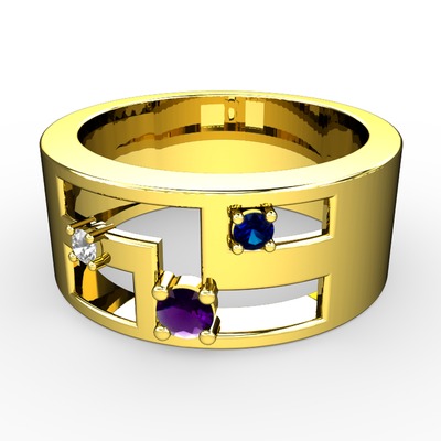 Ametist, beyaz zirkon ve lab safir 14 ayar altın yüzük