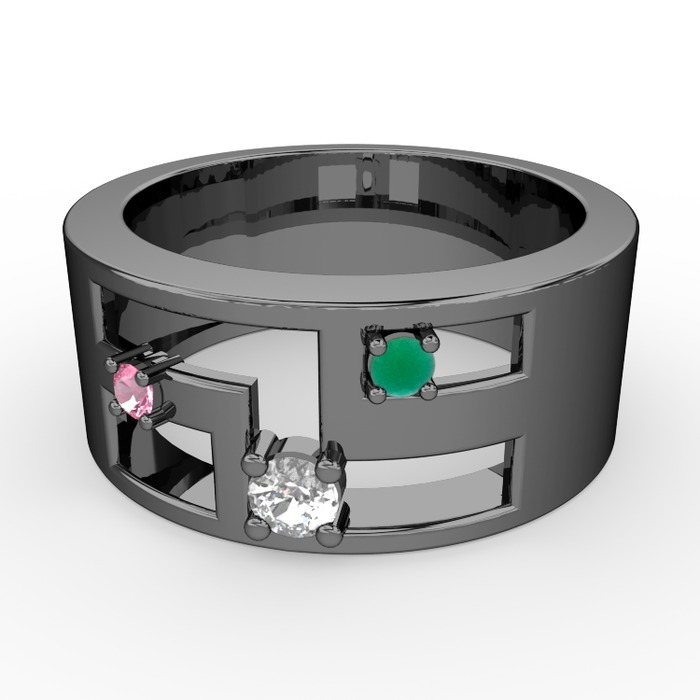 Beyaz zirkon, pembe kuvars ve kök zümrüt 925 ayar siyah rodyum kaplama gümüş yüzük