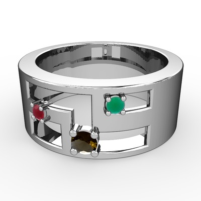 Dumanlı kuvars, kök yakut ve kök zümrüt 8 ayar beyaz altın yüzük
