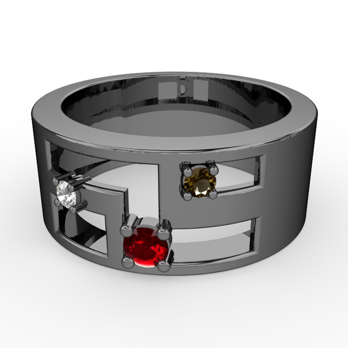 Garnet, pırlanta ve dumanlı kuvars 925 ayar siyah rodyum kaplama gümüş yüzük (0.036 karat)