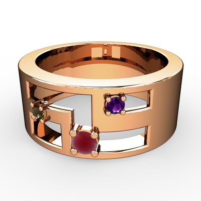 Kök yakut, dumanlı kuvars ve ametist 18 ayar rose altın yüzük
