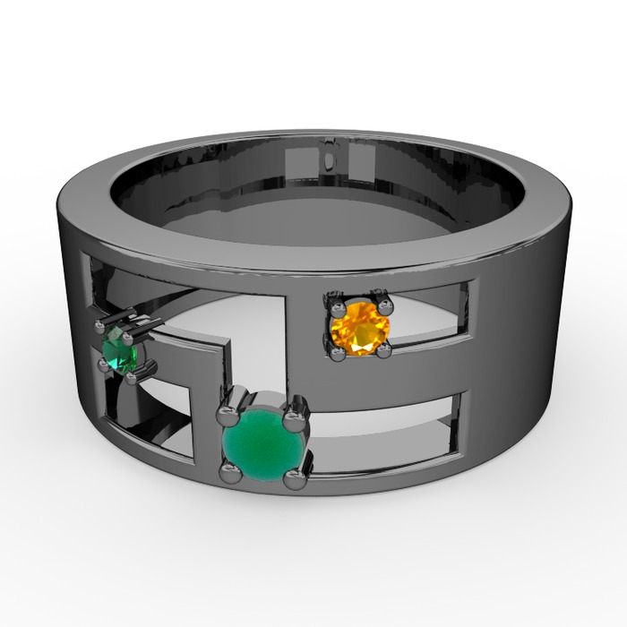Kök zümrüt, yeşil kuvars ve sitrin 925 ayar siyah rodyum kaplama gümüş yüzük