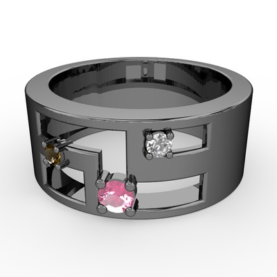 Pembe kuvars, dumanlı kuvars ve beyaz zirkon 925 ayar siyah rodyum kaplama gümüş yüzük