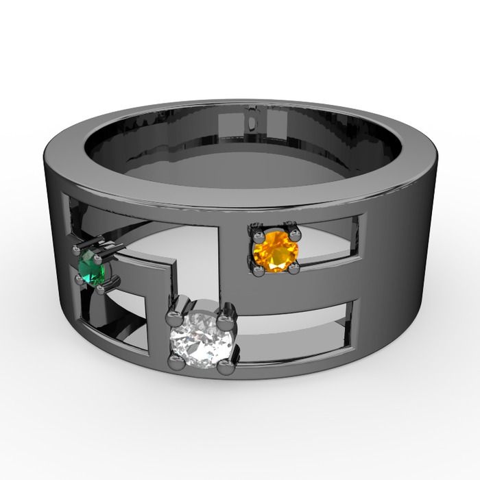 Pırlanta, yeşil kuvars ve sitrin 925 ayar siyah rodyum kaplama gümüş yüzük (0.11 karat)