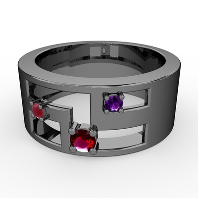 Rodolit garnet, kök yakut ve ametist 925 ayar siyah rodyum kaplama gümüş yüzük
