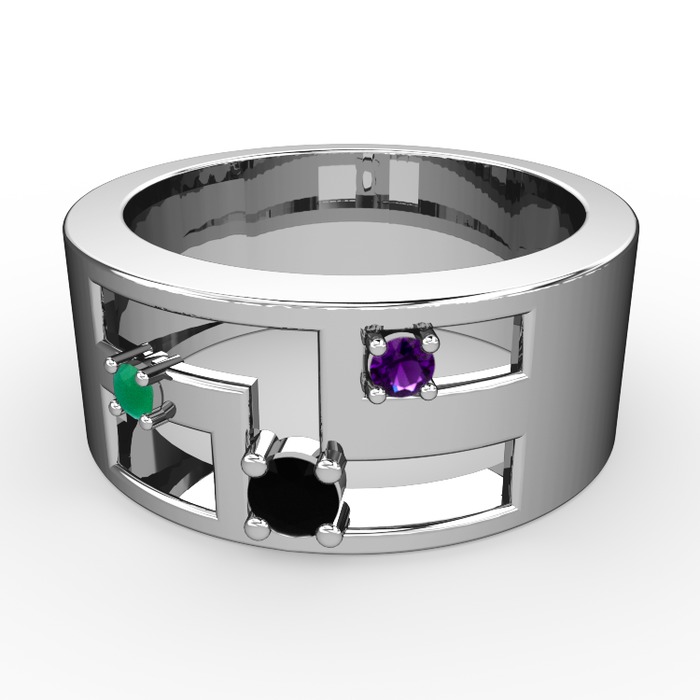 Siyah zirkon, kök zümrüt ve ametist 14 ayar beyaz altın yüzük