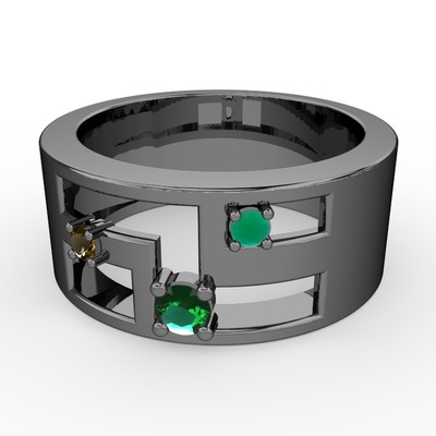 Yeşil kuvars, dumanlı kuvars ve kök zümrüt 925 ayar siyah rodyum kaplama gümüş yüzük