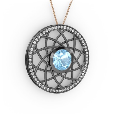 Akuamarin ve beyaz zirkon 925 ayar siyah rodyum kaplama gümüş kolye (40 cm rose altın rolo zincir)